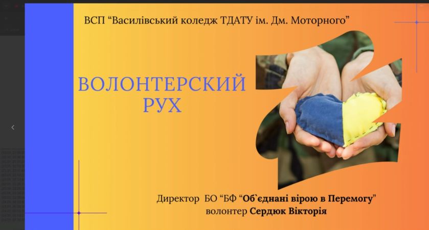 3 травня 2024 року, викладачем юридичних дисциплін ВСП «Василівський фаховий коледж ТДАТУ» Вікторією Сердюк, була створена благодійна організація “Благодійний фонд “Об’єднані вірою в Перемогу”. Волонтерською діяльністю Вікторія Анатоліївна займається з 2022 року в рамках інших проектів і дане рішення було виважене і необхідне.