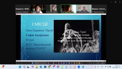 І МІСЦЕ – Софію Андрієнко, студентку ІІ курсу спеціальності 211 Ветеринарна медицина у номінації “Аудіовізуальний твір”. Її буктрейлер до драматичної поеми “Оргія” набрав найбільшу кількість переглядів і схвальних відгуків.