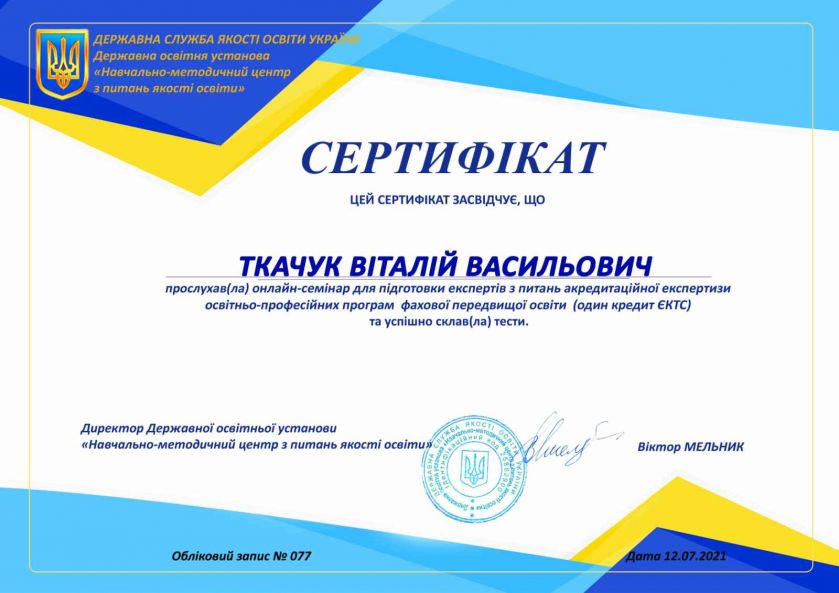Віталій Васильович пройшов повний цикл семінарів з питань акредитації освітньо-професійних програм фахової передвищої освіти, які були влаштовані Державною освітньою установою «Навчально-методичний центр з питань якості освіти». Мета семінарів – підвищення кваліфікації працівників закладів освіти, відповідальних за акредитацію освітньо-професійних програм фахової передвищої освіти.