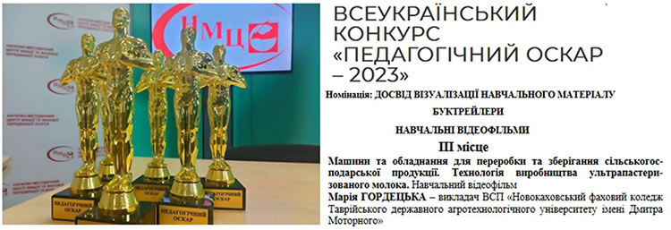 За підсумками Всеукраїнського конкурсу «Педагогічний ОСКАР – 2023» у номінації:» Досвід візуалізації навчального матеріалу буктрейлери. Навчальні відеофільми» ІІІ місце отримала робота Марії Гордецької «Машини та обладнання для переробки та зберігання сільськогосподарської продукції. Технологія виробництва ультрапастеризованого молока. Навчальний відеофільм».