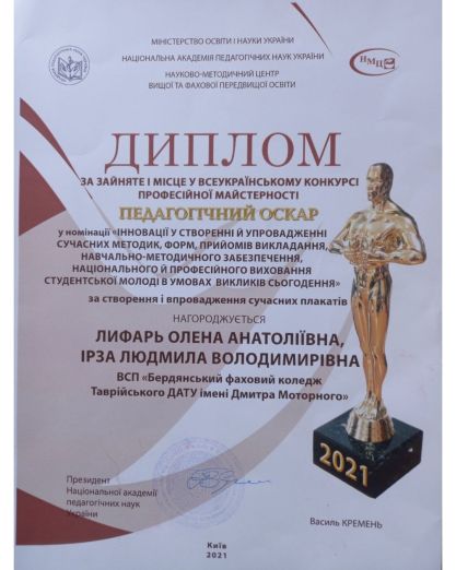 Державна установа «Науково-методичний центр вищої та фахової передвищої освіти» з метою вивчення і поширення досвіду інноваційної педагогічної діяльності, сприяння зростанню професійної майстерності педагогів, підвищення ефективності освітнього процесу у 2020/2021 навчальному році проводила конкурс професійної майстерності «Педагогічний ОСКАР – 2021».