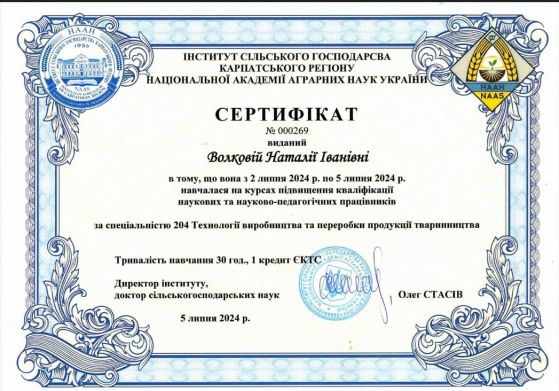 Макушенко Світлана Степанівна підвищила кваліфікацію з питань інтегрованого захисту і карантину рослин при Інституті захисту рослин НААН. А Волкова Наталія Іванівна вивчала науково-інноваційні технології годівлі, вирощування, утримання, підвищення продуктивності та збереження тварин при Інституті сільського господарства Карпатського регіону НААН.