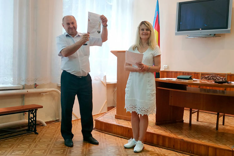 Директор ВСП «Новокаховський фаховий коледж ТДАТУ» Олександр Гребінчак та заступник директора з навчальної роботи Лариса Назарова на останньому засіданні педагогічної ради вручили викладачам коледжу дипломи за перемогу у Всеукраїнському конкурсі професійної майстерності «Педагогічний Оскар 2021».