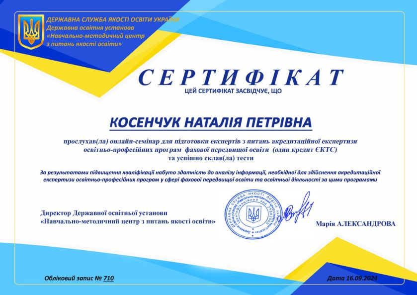 Викладачка коледж пройшла курс семінарів для кандидатів у експерти з акредитації закладів фахової передвищої освіти та успішно склала підсумкове тестування. Наталія Петрівна може бути залучена до проведення акредитаційної експертизи освітньо-професійних програм фахових коледжів.