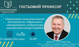 Шановні викладачі, аспіранти, здобувачі вищої освіти та всі охочі! Запрошуємо 22 травня 2024 р. о 14.00 на гостьову лекцію «КЕРУВАННЯ МАКСИМАЛЬНОЮ ПОТУЖНІСТЮ ГІБРИДНОГО СИНХРОННОГО ГЕНЕРАТОРА АВТОНОМНОЇ ВІТРОТУРБІНИ».