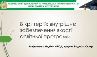 23 лютого 2023 року відбулась нарада-семінар «8 критерій: внутрішнє забезпечення якості освітньої програми» від відділу моніторингу якості освітньої діяльності ТДАТУ. На захід були запрошені декани факультетів, керівник ННІ ЗУП, завідувачі кафедр та гаранти освітніх програм, як координаторів у контексті здійснення процесів і процедур внутрішнього забезпечення якості вищої освіти.