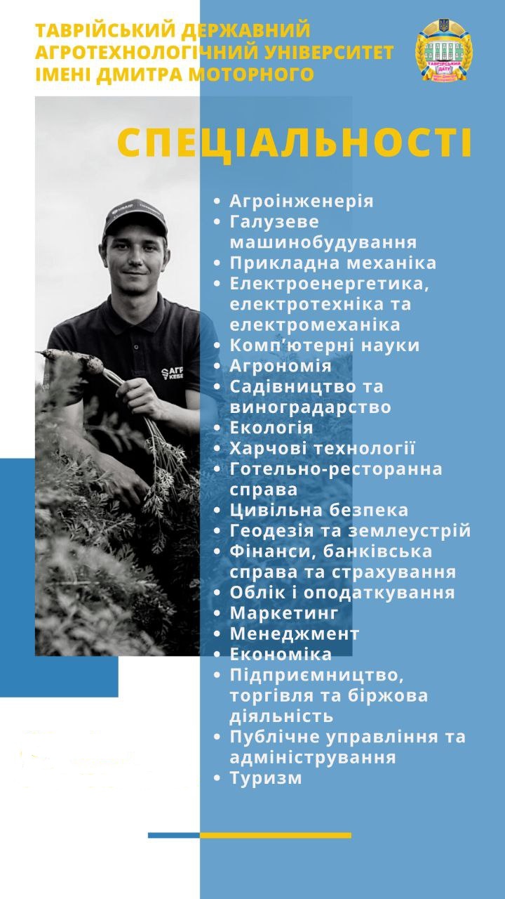 Таврійський державний агротехнологічний університет імені Дмитра Моторного здійснює підготовку фахівців на 4 факультетах за 21 освітніми програмами.