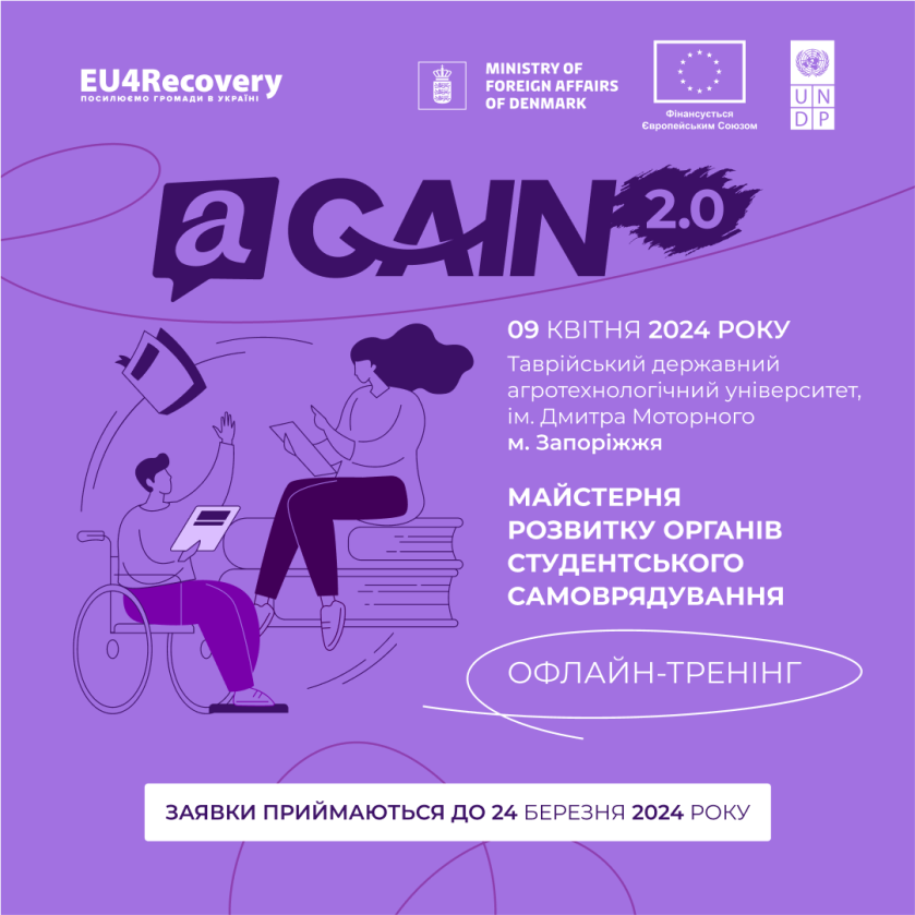 Майстерню розвитку органів студентського самоврядування “aGAIN” організовано UNDP в Україні за фінансової підтримки Європейського Союзу, наданої в межах проєкту «EU4Recovery — Розширення можливостей громад в Україні», та Уряду Данії.