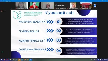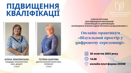 26 жовтня 2023 року в межах діяльності Вищої школи педагогічної майстерності ТДАТУ відбувся онлайн-практикум на тему: «Візуальний простір в цифровому середовищі». Проводили заняття викладачі кафедри суспільно-гуманітарних наук, д.філол.н., професор Тетяна Шарова та к.філол.н., доцент Аліна Землянська.