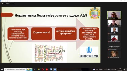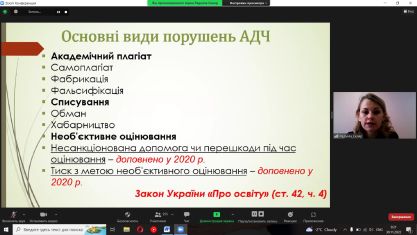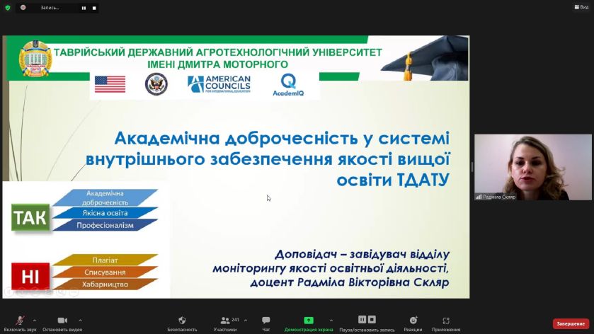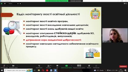 30 листопада 2022 р. відбувся онлайн-семінар «Академічна доброчесність у системі внутрішнього забезпечення якості вищої освіти ТДАТУ», який було організовано відділом моніторингу якості освітньої діяльності університету.