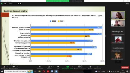 Пан Олександр представив доповідачку семінару завідувачку відділу моніторингу якості освітньої діяльності, доцента Радмілу Скляр. На початку своєї доповіді, пані Радміла, акцентувала увагу на меті даного зібрання – це розглядання основних вимог існуючого законодавства та нормативних документів щодо дотримання норм академічної доброчесності в розрізі функціонування системи внутрішнього забезпечення якості університету. Також, за результатами пройдених в 2020-2021 та 2021-2022 навч. роках опитувань викладачів та здобувачів вищої освіти від Американських рад з міжнародної освіти, представити порівняльний аналіз відповідей, виокремити проблемні моменти та на базі отриманих даних створити модель щодо подальшого покращення забезпечення академічної доброчесності та якості вищої освіти у ТДАТУ.