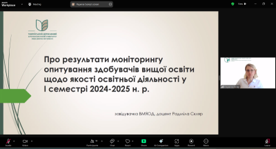 29 квітня 2025 року відбулось планове засідання Науково-методичної ради Таврійського державного агротехнологічного університету імені Дмитра Моторного (детальніше…). Другим питанням на порядку денному було: «Про результати моніторингу опитування здобувачів вищої освіти щодо якості освітньої діяльності у І семестрі 2024-2025 н. р.», яке присутнім доповіла завідувачка відділу моніторингу якості освітньої діяльності, доцент Радміла Скляр.