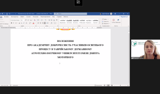 28 листопада 2023 року відбулось планове засідання Вченої ради Таврійського державного агротехнологічного університету імені Дмитра Моторного (детальніше…). Одним з питань на порядку денному було: «Про дотримання учасниками освітнього процесу положень Кодексу честі ТДАТУ та принципів академічної доброчесності», яке присутнім доповіла завідувачка відділу моніторингу, к.т.н., доцент Радміла Скляр. Відповідно до Закону України «Про вищу освіту» забезпечення […]