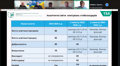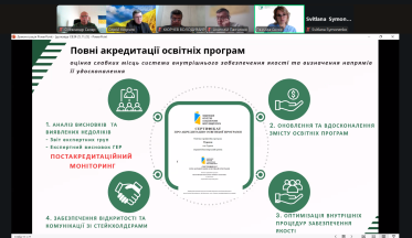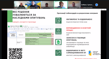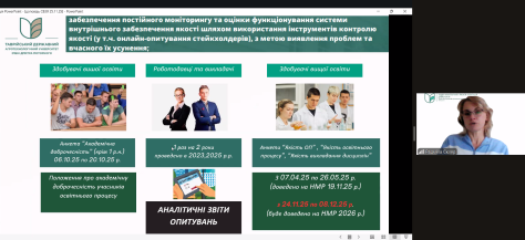 У виступі були представлено результати моніторингу й перегляду освітніх програм, стан оновлення обов’язкових освітніх компонентів у Google-таблицях, а також динаміку залучення здобувачів через опитування та обговорення пропозицій, які стали основою для корекції ОП 2026 року. Окрему увагу було приділено участі стейкхолдерів, документальному забезпеченню процедур, виконанню оновлених вимог акредитації та результатам двох успішних акредитацій, що підтвердили дієвість системи та окреслили напрями подальшої роботи.
