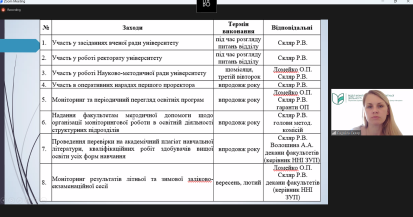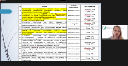 30 серпня 2023 року відбулось установче засідання Науково-методичної ради Таврійського державного агротехнологічного університету імені Дмитра Моторного (детальніше…). Два з шості питань на порядку денному були: «Про затвердження плану роботи відділу моніторингу якості освітньої діяльності ТДАТУ на 2023-2024 н.р.» та «Про внесення змін до процедури розгляду та затвердження робочих програм обов’язкових навчальних дисциплін», які присутнім доповіла завідувачка відділу моніторингу якості освітньої діяльності, доцент Радміла Скляр.