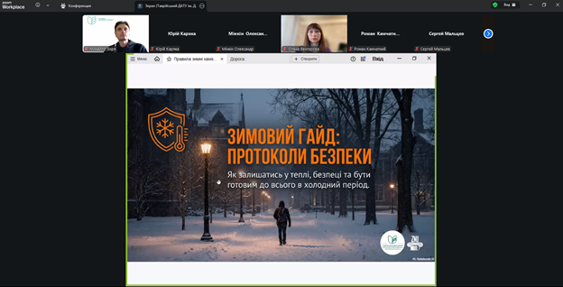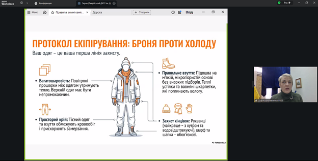 До виступу по першому питанню була долучена старший викладач кафедри цивільної безпеки Галько Тетяна Іванівна. У своїй доповіді Тетяна Іванівна акцентувала увагу на діях у надзвичайних ситуаціях у зимовий період (правила безпечної поведінки на водних об’єктах, на льоду, під час ожеледиці, у побуті, в громадських місцях, в умовах воєнного стану), профілактиці травматизму, обморожень та нещасних випадків, а також безпеці дорожнього руху.