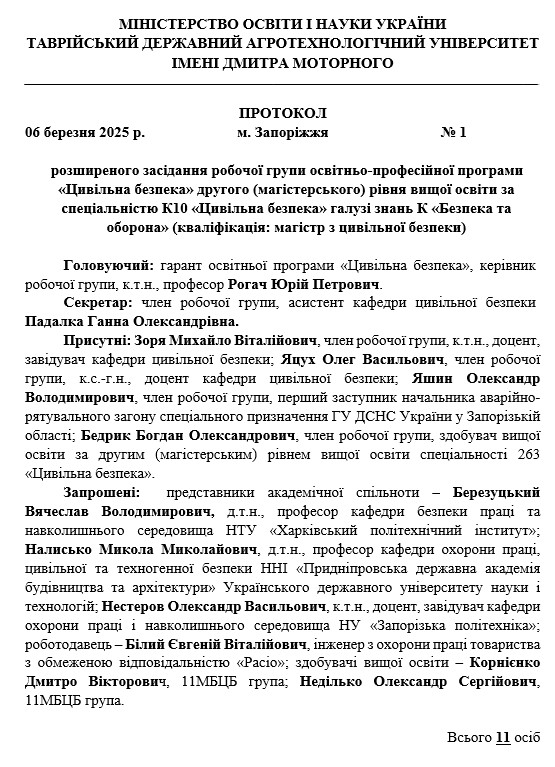 6 березня 2025 р. відбулося розширене засідання робочої групи освітньо-професійної програми “Цивільна безпека” другого (магістерського) рiвня вищої освiти. На засіданні були присутні члени робочої групи, представники від академічної спільноти, роботодавців та студентського активу.