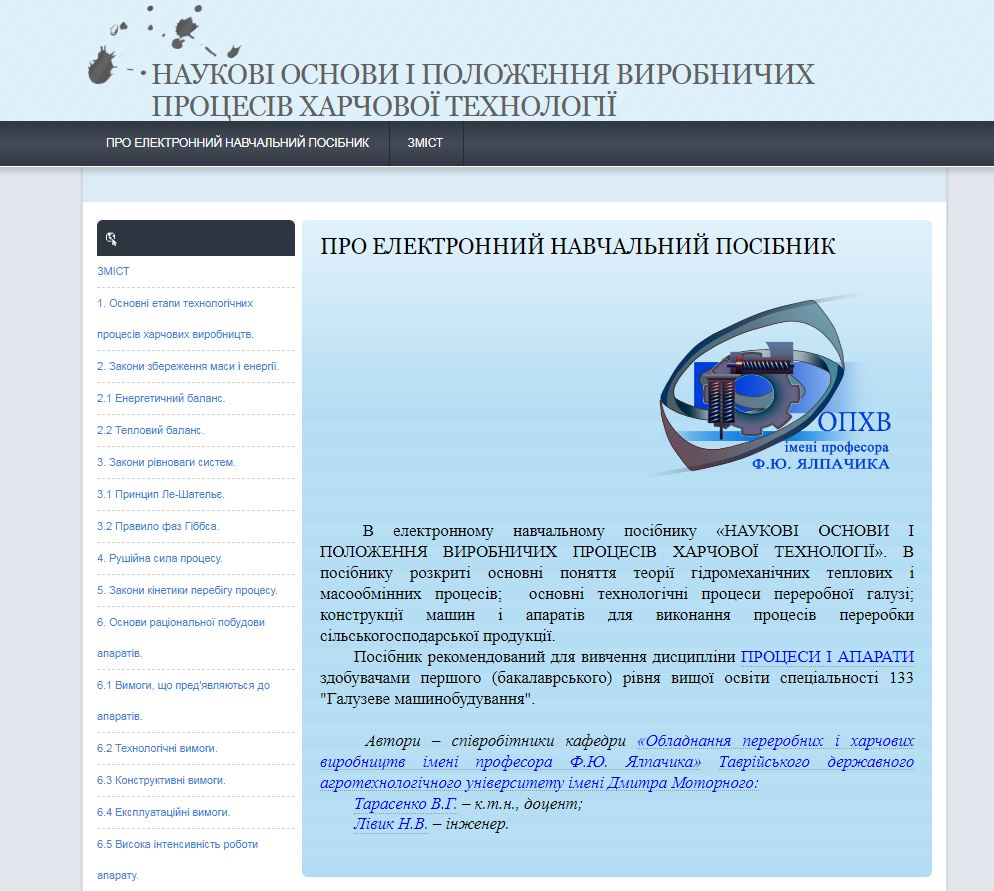 В електронних посібниках розкриті основні поняття теорії гідромеханічних теплових і масообмінних процесів; основні технологічні процеси переробної галузі; конструкції машин і апаратів для виконання процесів переробки сільськогосподарської продукції.
