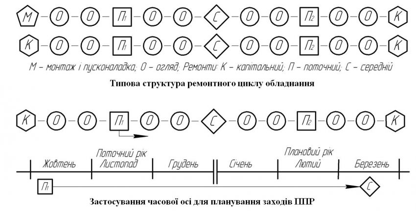 Структура ремонтного циклу – це чергування у відповідній послідовності ремонтно-обслуговуючих впливів, як-то планових ремонтів і оглядів (обслуговувань), яка найкраще забезпечує якісний ремонт обладнання.