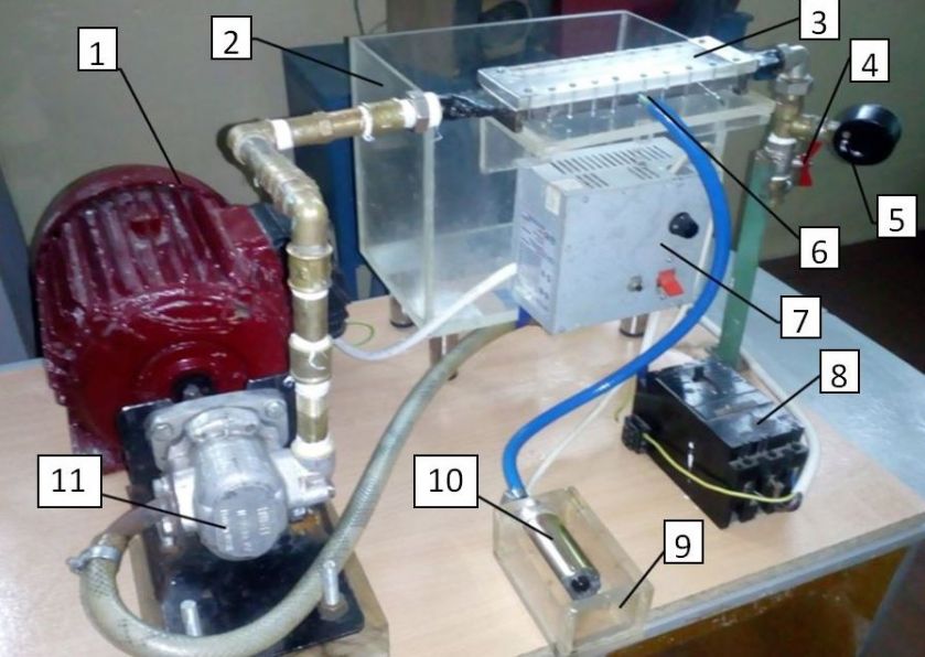 1 – електродвигун; 2 – ємність для знежиреного молока; 3 –камера гомогенізації; 4 – дроселюючий вентиль; 5 – манометр; 6 – канал подачі вершків; 7 – блок керування насосу подачі вершків; 8 – електричний пускач основного двигуна; 9 – ємність для вершків; 10 – насос для подачі вершків; 11 – насос подачі знежиреного молока.