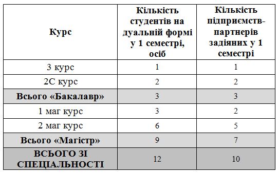 З проведеного аналізу за перший семестр можна зробити впевнений висновок, що дуальне навчання сприяє підвищенню рівня фахової компетентності студентів, формує й розвиває в них основні практичні навички, що у свою чергу сприяє підвищенню ефективності подальшої професійної діяльності, забезпечує реальні вимоги провідних виробництв і створює передумови для успішної реалізації випускників на ринку праці.