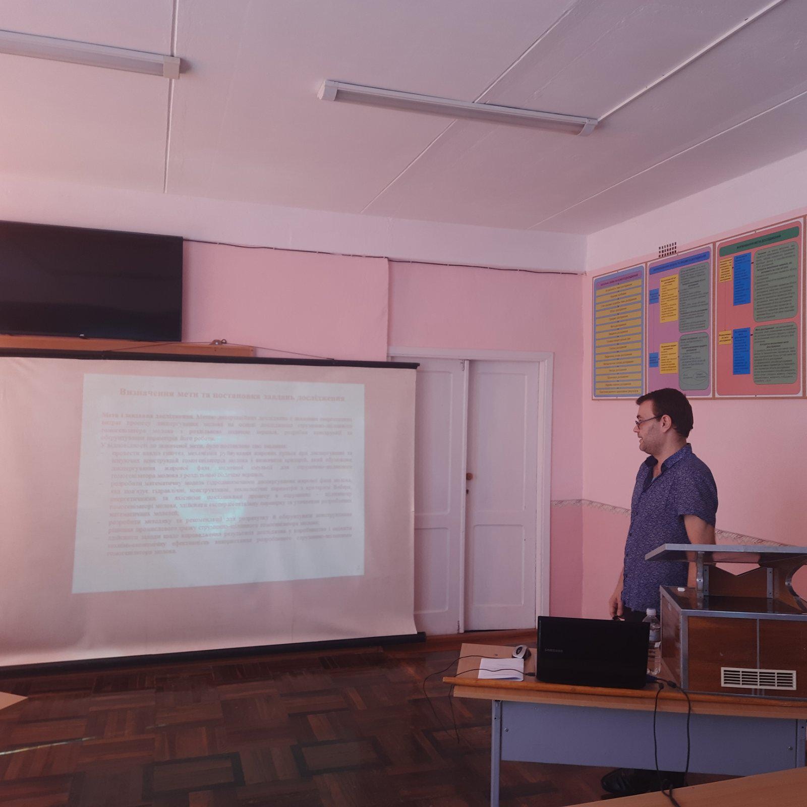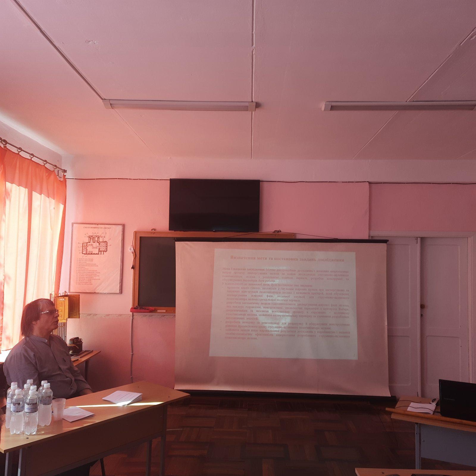 02.07.2020 в аудиторії 8.310 відбулося розширене засідання кафедри обладнання переробних і харчових виробництв імені професора Ф. Ю. Ялпачика та науково-технічної ради НДІ МЗПУ. На засіданні були присутні 20 чоловік, серед яких 10 членів науково-технічної ради НДІ МЗПУ. Головним питанням денного порядку, яке розглядалось на зібранні було представлення та обговорення результатів закінченої дисертаційної роботи асистента кафедри ОПХВ Ковальова О. О на тему «Розробка конструкції та обґрунтування параметрів струминно–щілинного гомогенізатора молока з роздільною подачею вершків» (керівник: д. т. н., доц., завідувач кафедри ОПХВ Самойчук К. О.).
