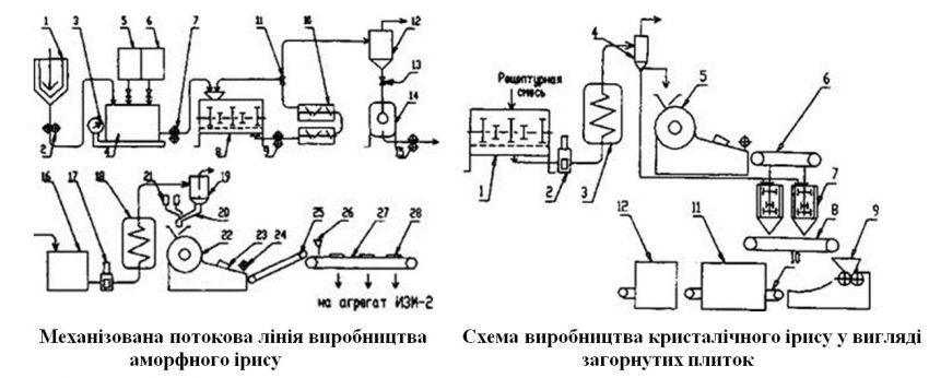 Для отримання кристалічного (тиражованого) ірису зварену ірисну масу вимішують протягом 10-20хв, вона охолоджується, стає перенасиченої по сахарозі. В гарячій масі утворюються центри кристалізації, які потім, після формування, загортання і охолодження ірису до 20°С виростають в кристали розміром 2-6 нм, утворюючи кристалічну структуру.