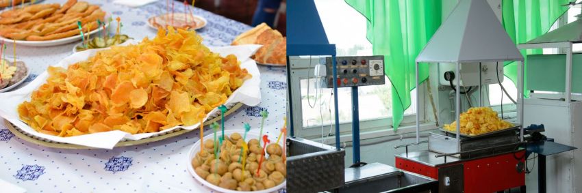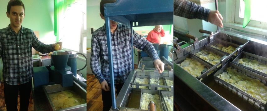 Очищення роблять на абразивних машинах різної продуктивності як безупинної, так і періодичної дії. Після очищення картоплі проводять доочищення вручну клинчастими ножами (видалення залишків шкірочки, вічок). Очищену картоплю ріжуть на овочерізках. Для відмивання крохмалю зі скибочок картоплі, їх промивають у воді й обполіскують під душем, видаляють надлишки води на вібраторах чи осушувачах. Потім скибочки подають на смаження до фритюрниці. Обсмажують картопляні скибочки, занурені в нагріту рослинну олію з початковою температурою 180 – 195 °С. Температура обсмажування 155 – 165 °С. Далі видаляють надлишок олії на дротовому ситі чи вібраторах, де надлишки олії стікають. В охолоджену «хрустку картоплю» перед розфасовкою додають сіль або смакові добавки. «Хрустку картоплю» розфасовують у пакети з лакованого целофану чи ламінованої плівки, застосовуючи термозварювання пакетів. Далі пакети укладають у гофроящики.