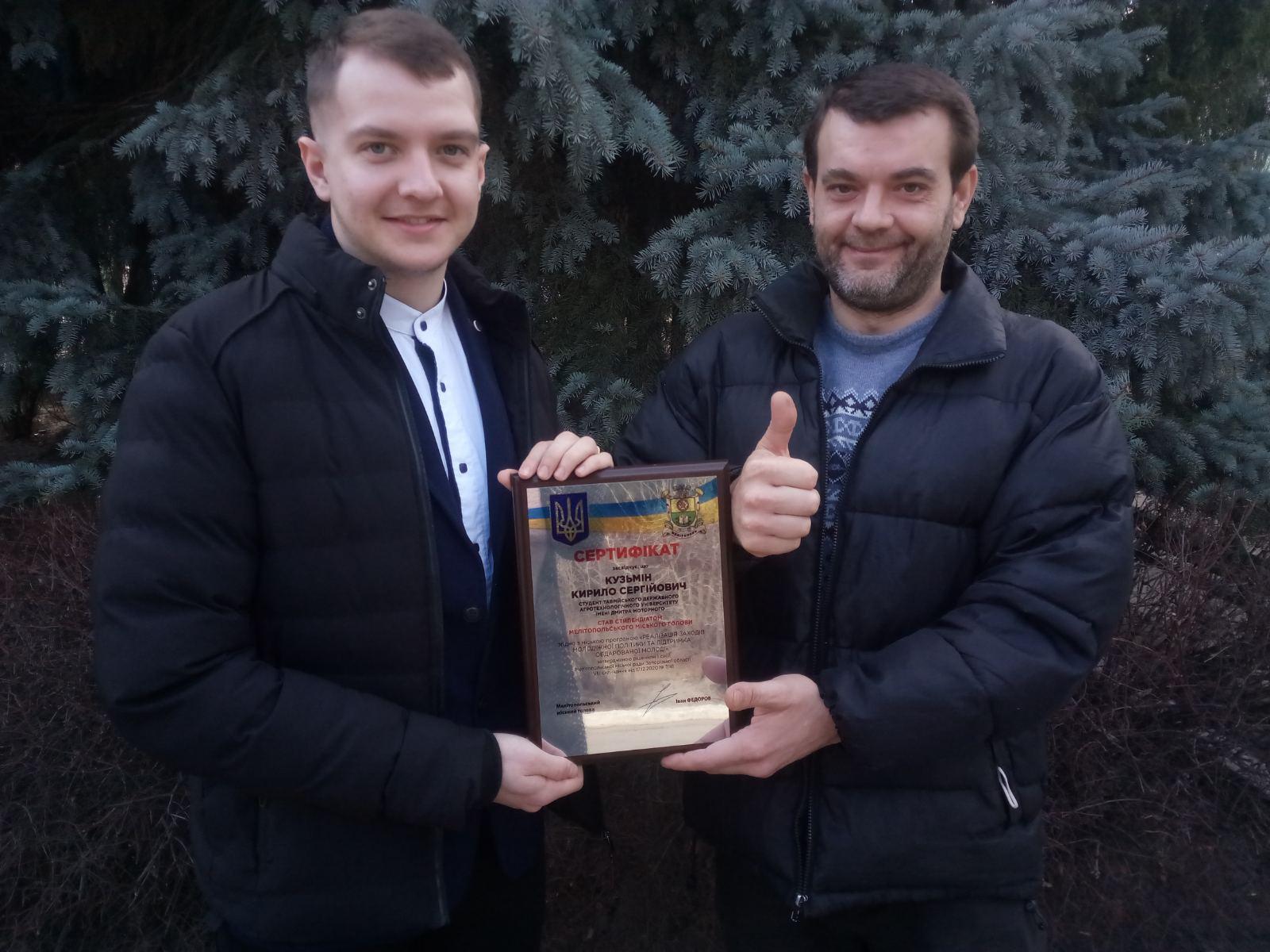 Цього року в номінації «Науково-дослідницька та пошукова діяльність» переможцем став студент механіко-технологічного факультету спеціальності «Галузеве машинобудування» 31 ГМ групи Кирило Кузьмін (куратор асистент кафедри обладнання переробних і харчових виробництв імені професора Ф. Ю. Ялпачика Олександр Ковальов). Мелітопольський міський голова привітав переможців, які мають видатні досягнення в галузі науки та спорту та вручив стипендіатам іменні сертифікати. Нагадаємо, що першим отримувачем стипендії міського голови Мелітополя в 2019 був студент спеціальності «Галузеве машинобудування» 21 МБГМ групи Михайло Лебідь.