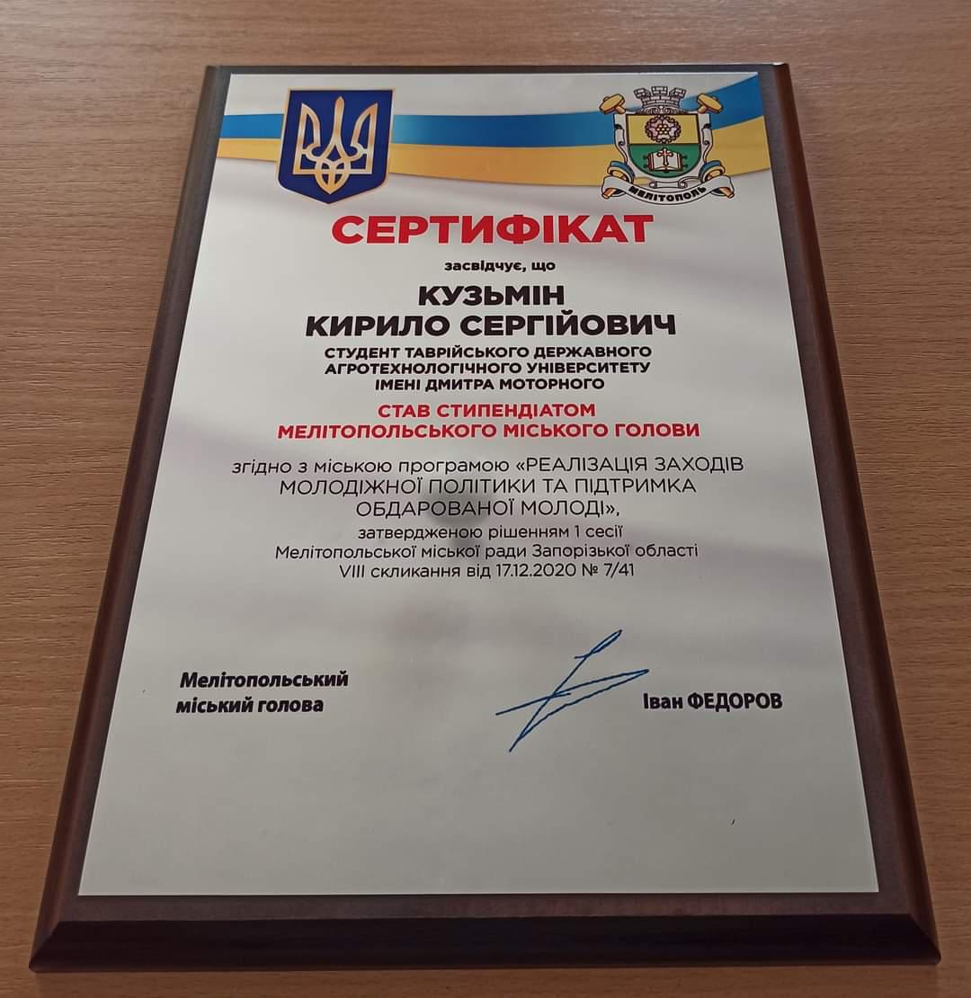 Згідно до програми “Реалізація заходів молодіжної політики та підтримки обдарованої молоді”, спрямованої на заохочення та підтримку обдарованої молоді 4 березня 2021 р на засіданні виконавчого комітету Мелітопольської міської ради відбулось урочисте вручення іменних сертифікатів переможцям конкурсу, які протягом поточного семестру будуть отримувати додатково до основної іменну стипендію міського голови Мелітополя.