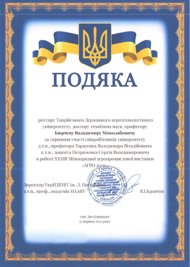з 8 по 11 червня 2021 року в м. Київ, в рамках договору про науково-навчальну співпрацю між ТДАТУ та НВП «РОСТА» від 1.09.2019 р., для забезпечення експозиції НВП «РОСТА» в рамках ХХХІІІ Міжнародної Агропромислової виставки „АГРО-2021” к.т.н., доцент кафедри обладнання переробних і харчових виробництв імені професора Ф.Ю. Ялпачика Петриченко Сергій Володимирович прийняв участь у тематичній експозиції «Провайдинг продукції регіонального машинобудування»
