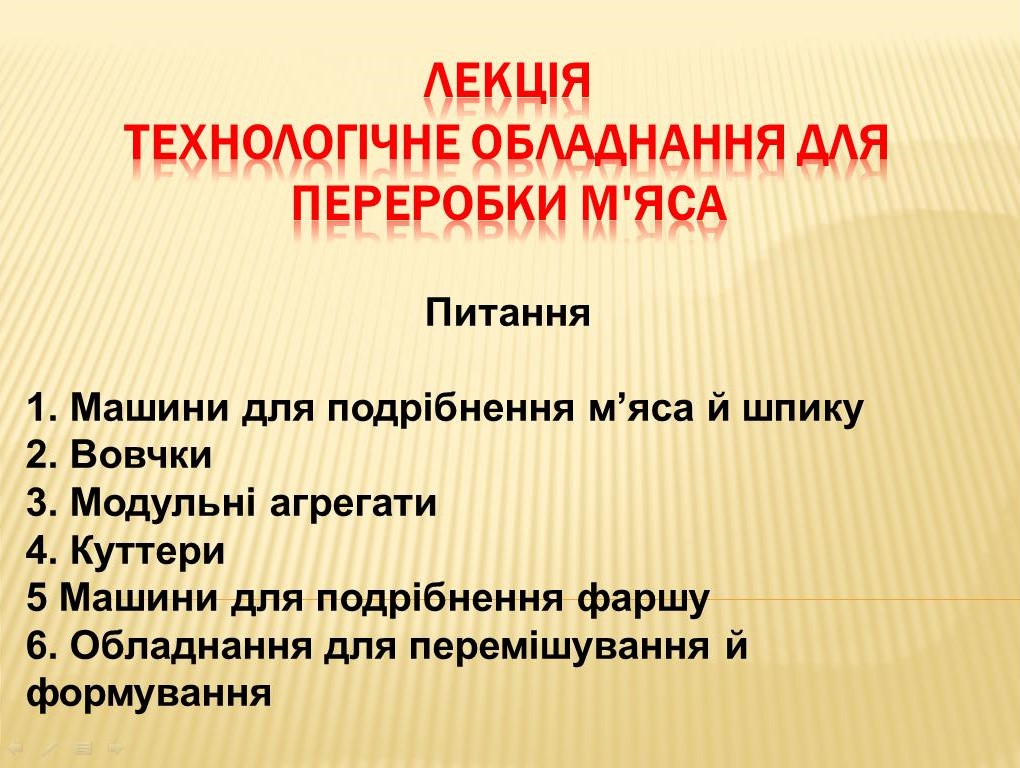 В межах тематики відкритої лекції були висвітлені основні вимоги до технологічного обладнання м’ясної промисловості. Наведено класифікацію основного обладнання, приведені технологічні та кінематичні схеми машин.