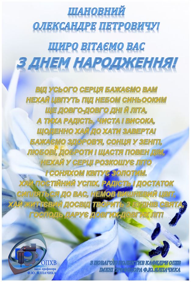 Колектив кафедри обладнання переробних і харчових виробництв імені професора Ф.Ю. Ялпачика вітає з Днем народження проректора з науково-педагогічної роботи, к.т.н., доцента Ломейка Олександра Петровича!