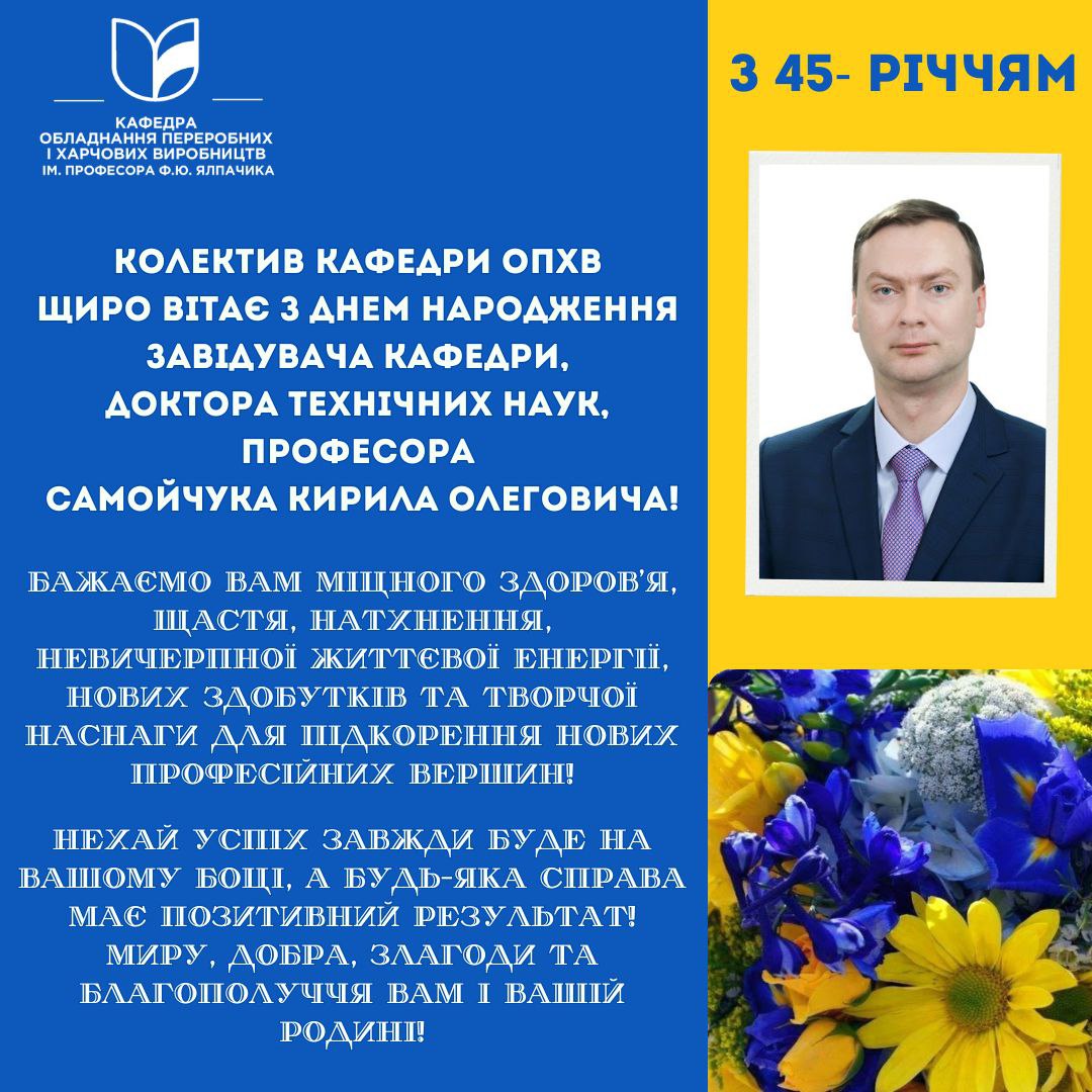 Вітаємо з днем народження завідувача кафедри, доктора технічних наук, професора Самойчука Кирила Олеговича 9.04.2024
