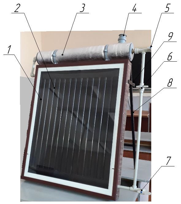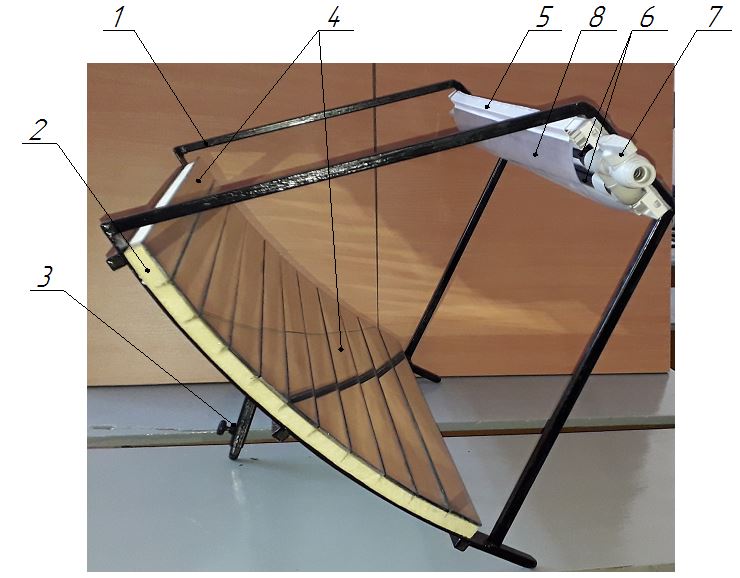 1 – корпус; 2 – пінополістирол; 3 – механізм регулювання висоти; 4 – параболічна дзеркальна поверхня; 5 – абсорбер; 6 – трубки абсорберу ; 7- кран шаровий; 8 – захисний екран.