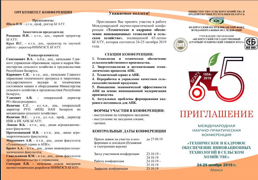 Снимок24-25 жовтня  2019 року  викладачі кафедри обладнання переробних і харчових виробництв імені професора Ф.Ю. Ялпачика прийняли участь у роботі міжнародної науково-практичної конференції «Техническое и кадровое обеспечение инновационныхтехнологий в сельском хозяйстве», яка проводилась на базі Білоруського державного аграрно технологічного університету міста Мінськ. За матеріалами конференції було сформовано збірник тез доповідей.