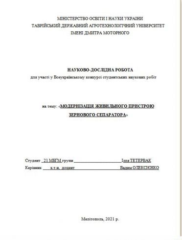 Також здобувачем Тетервак І.Р . була підготована науково-дослідна робота для участі у Всеукраїнському конкурсі студентських наукових робіт на тему: «Модернізація живильного пристрою зернового сепаратора».