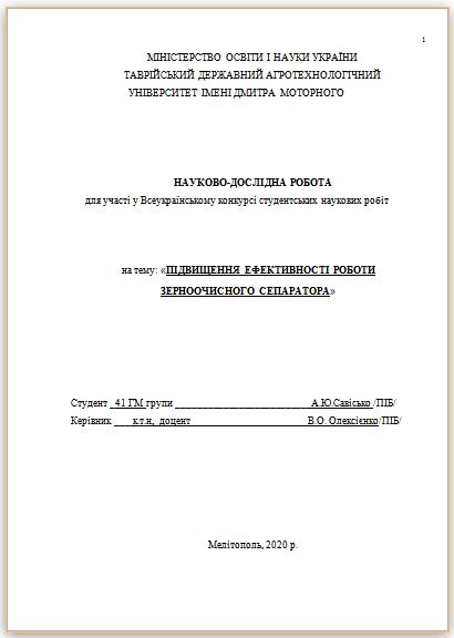 Також здобувачем Савісько А.Ю. була підготована науково-дослідна робота для участі у Всеукраїнському конкурсі студентських наукових робіт на тему: «ПІДВИЩЕННЯ ЕФЕКТИВНОСТІ РОБОТИ ЗЕРНООЧИСНОГО СЕПАРАТОРА». Робота виконана на основі проведених раніше досліджень, результати яких опубліковані в збірнику тез «Інноваційні технології розвитку у сфері харчових виробництв, готельно-ресторанного бізнесу, економіки та підприємництва: наукові пошуки молоді» Харків 2020 р. та в збірнику тез доповідей магістрантів та студентів ТДАТУ імені Дмитра Моторного, Мелітополь 2020 р.
