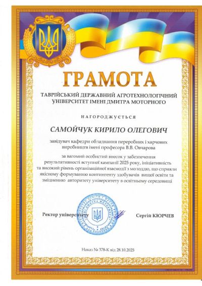 Самойчук Кирило Олегович, завідувач кафедри обладнання переробних і харчових виробництв імені професора Ф.Ю. Ялпачика, був нагороджений почесною грамотою за вагомий особистий внесок у забезпечення високої результативності вступної кампанії 2025 року.