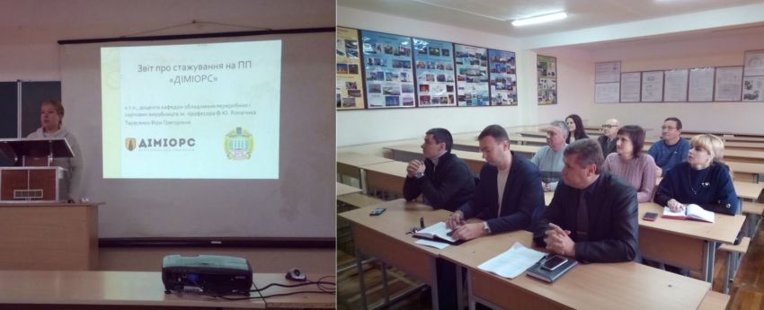 27 листопада 2019 року відбулося засідання кафедри обладнання переробних і харчових виробництв ім. проф. Ф.Ю.Ялпачика, на якому співробітники кафедри заслухали звіт доцента Тарасенко В.Г. про проходження виробничого стажування у ПП «ДІМІОРС». На обговоренні звіту були присутні проректор з НПР Ломейко О. П., декан механіко-технологічного факультету Кюрчев С. В. та методист Інституту підвищення кваліфікації Бараннік А. К.