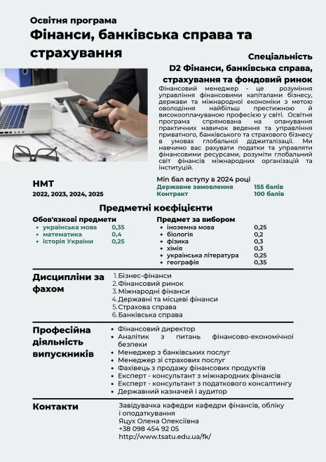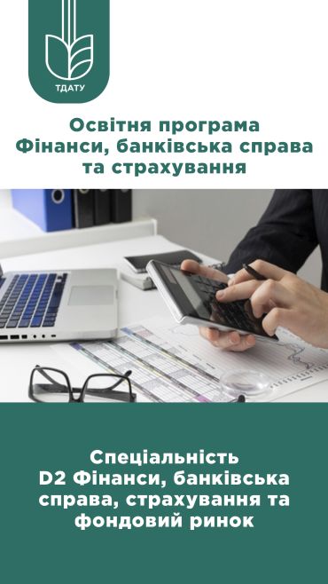 ТДАТУ пропонує освітню програму D2 “ФІНАНСИ, БАНКІВСЬКА СПРАВА ТА СТРАХУВАННЯ ” за освітнім рівнем “Бакалавр”, “Магістр”.
