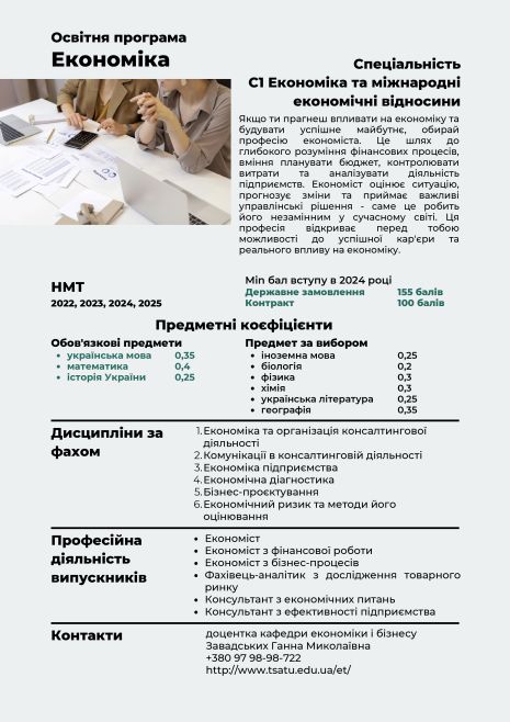 ТДАТУ пропонує майбутнім студентам освітню програму С1.01 “ЕКОНОМІКА”.