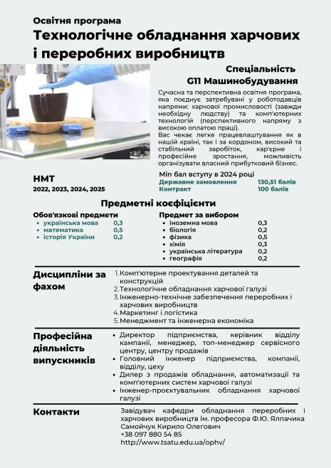 Освітня програма «ТЕХНОЛОГІЧНЕ ОБЛАДНАННЯ ХАРЧОВИХ І ПЕРЕРОБНИХ ВИРОБНИЦТВ» поєднує дві вкрай затребувані у роботодавців напрями: