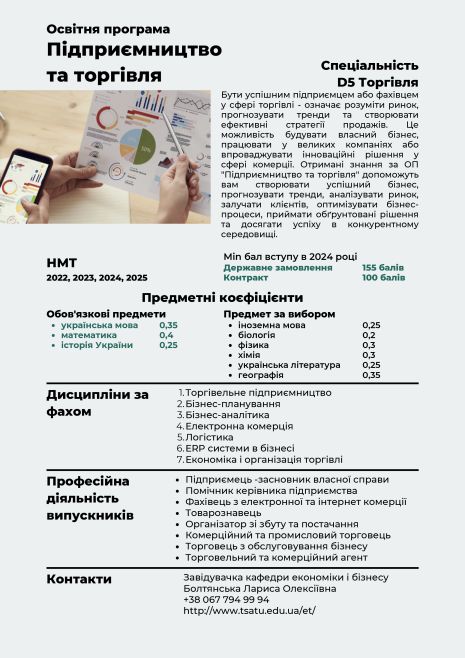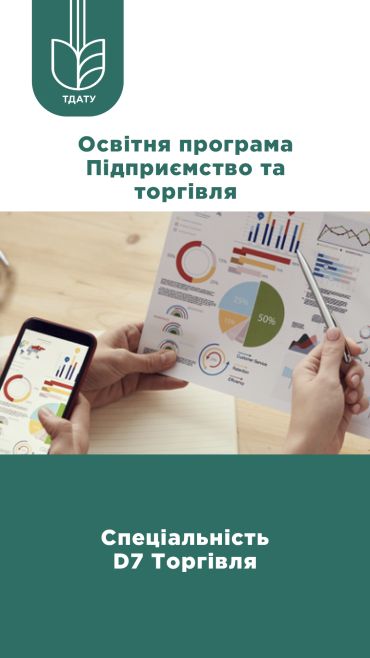 Таврійський державний агротехнологічний університет і мені Дмитра Моторного пропонує широкий спектр економічних спеціальностей, серед яких – спеціальність D7 ТОРГІВЛЯ ОПП «ПІДПРИЄМНИЦТВО ТА ТОРГІВЛЯ», яка сьогодні актуальна і перспективна.