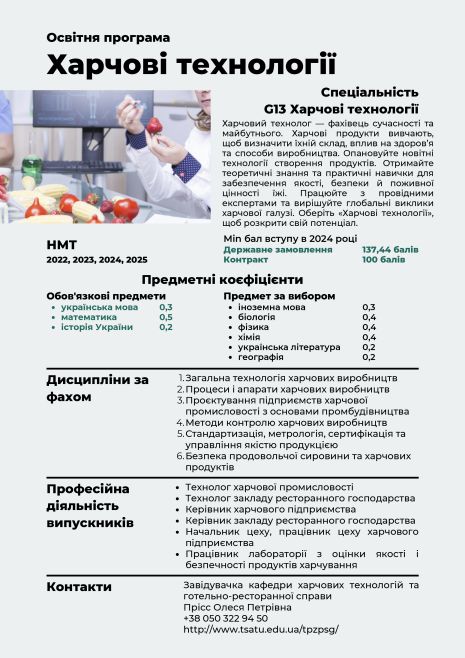 Оберіть освіту, що буде не лише цікавою, але й корисною для суспільства. Оберіть “Харчові технології” та розкрийте свій потенціал у галузі, яка завжди буде актуальною та важливою для кожного.