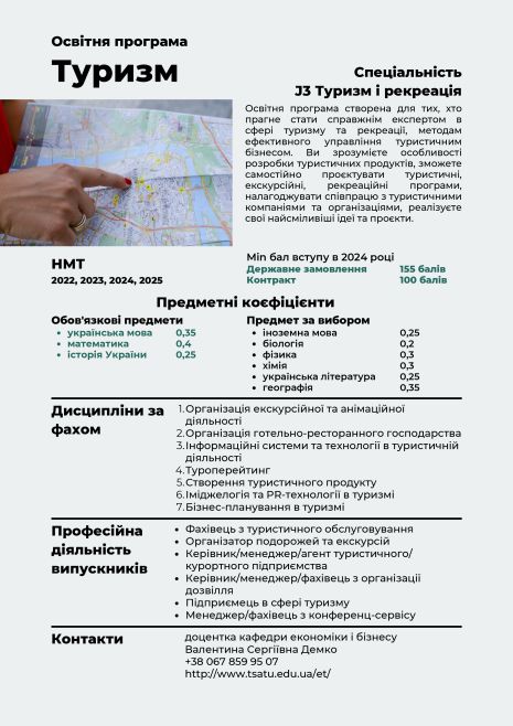 Освіта в галузі туризму – це інвестиція у свободу, розвиток та професійне життя, яке дарує емоції. Обираючи цю спеціальність, ти обираєш світ відкритих можливостей, культури, історії та нових горизонтів.