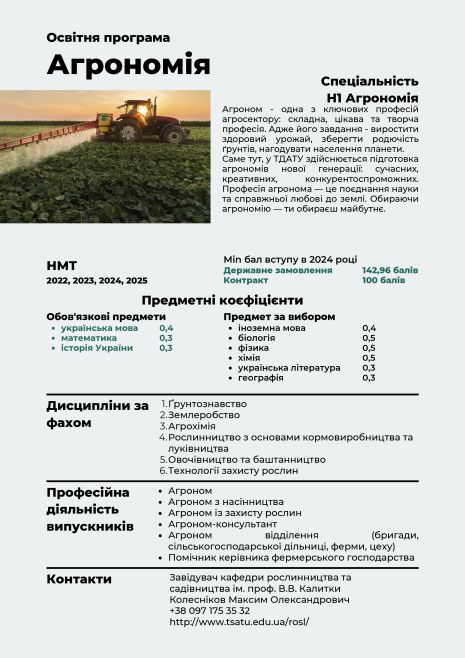 Таврійський державний агротехнологічний університет імені Дмитра Моторного пропонує здобути вищу освіту за спеціальністю Н1 АГРОНОМІЯ.