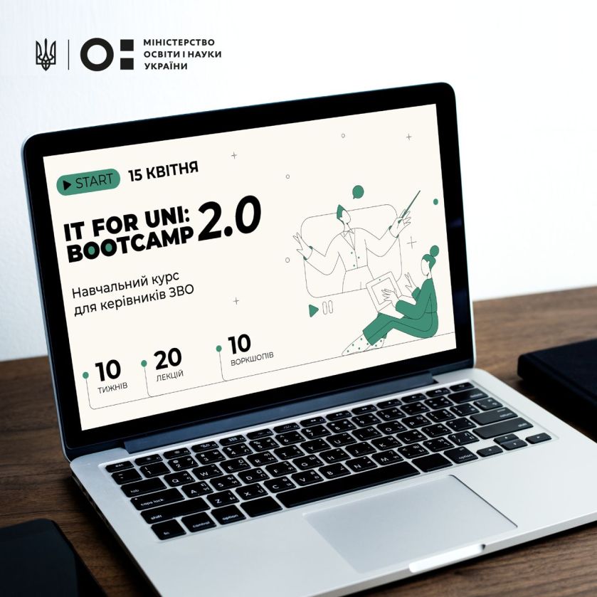 «IT for Uni: Bootcamp» — це безоплатний навчальний курс для керівників і менеджерів ЗВО з менеджменту й управління на прикладі ІТ-індустрії від Асоціації «IТ Ukraine», створений за підтримки Міністерства освіти і науки України та Мінцифри.