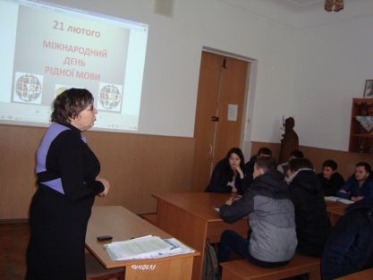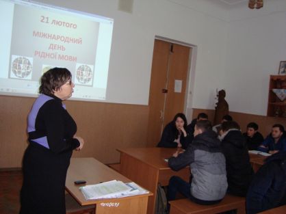 Саме цій події був присвячений виховний захід, який організували та провели викладачі кафедри суспільно-гуманітарних наук Зімонова О.В. та Шлєіна Л.І. для студентів ІІ курсу механіко-технологічного факультету. Присутнім було представлено відео- та аудіо матеріали з історії та розвитку української мови.