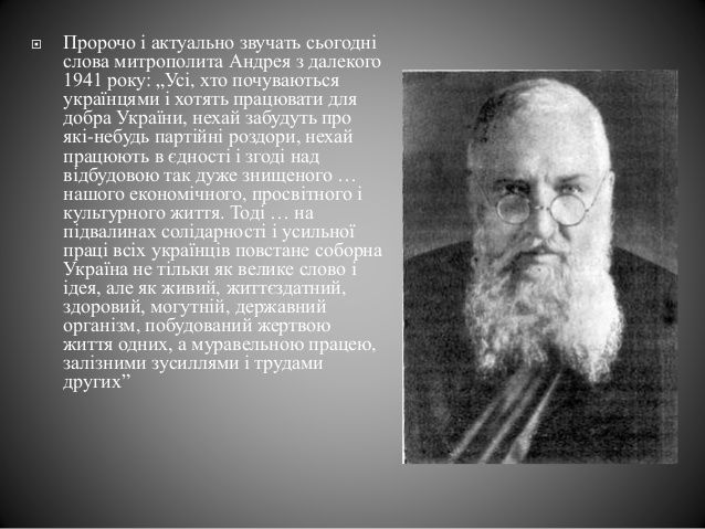 Неоднозначність у сприйнятті особи митрополита свідчить про його багатогранність та значимість. Він не влаштовував жоден неукраїнський уряд, що керував українськими землями. Хочеться вірити, що духовний лідер українців, яким був і залишається Андрей Шептицький, найближчим часом буде канонізований та отримає, врешті-решт, звання Праведника народів світу.